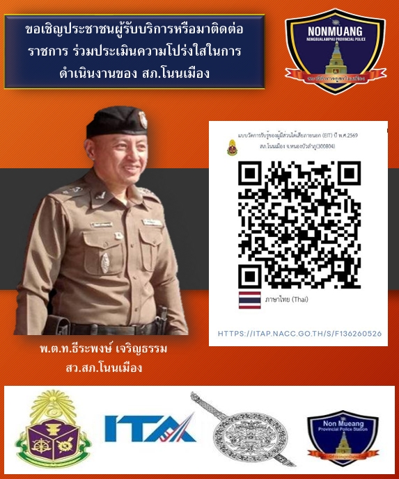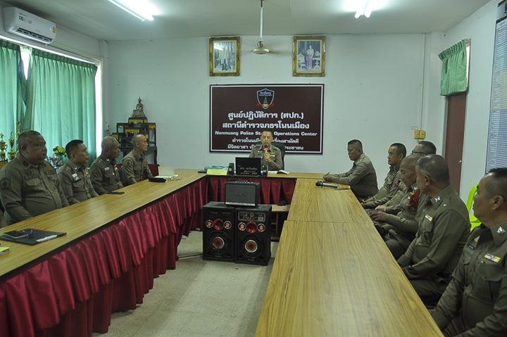พ.ต.ท.ธีรพงษ์ เจริญธรรม สว.สภ.โนนเมือง นำข้าราชการตำรวจ สภ.โนนเมือง เข้าแถวเคารพธงชาติ สวดมนต์ไหว้พระ กล่าวบทปลงใจ กล่าวคำปฏิญาณตนและ อุดมคติตำรวจ ตรวจการแต่งกาย ทรงผม จากนั้นร่วมทำกิจกรรม 5 ส. บริเวณโดยรอบอาคารสำนักงาน