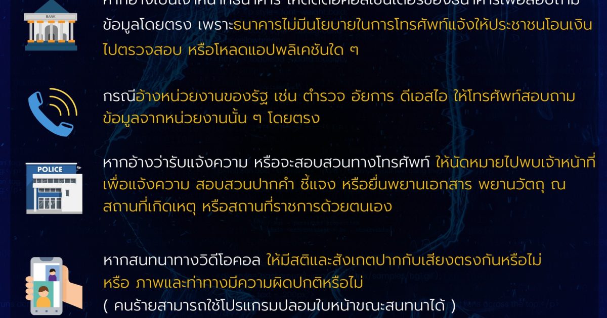 * หากอ้างเป็นเจ้าหน้าที่ธนาคารให้ติดต่อ call center ของธนาคารเพื่อสอบถามข้อมูลโดยตรง เพราะธนาคารไม่มีนโยบายในการโทรศัพท์แจ้งให้ประชาชนโอนเงินไปตรวจสอบ หรือโหลดแอปพลิเคชันใด ๆ