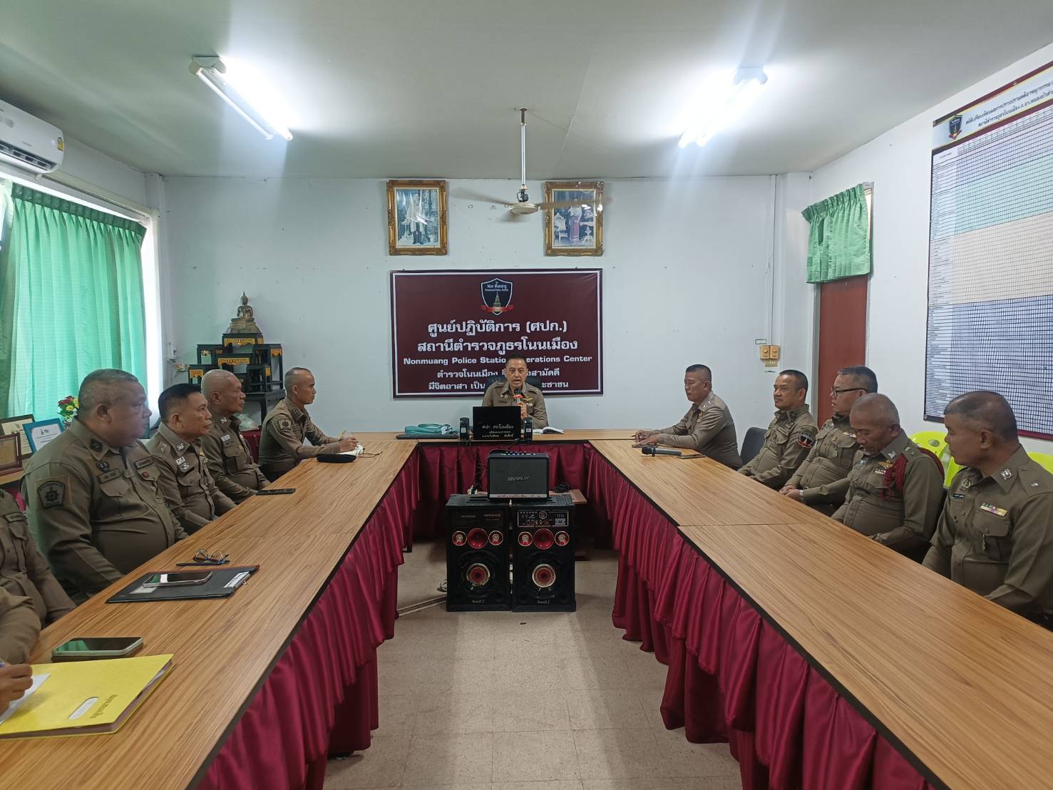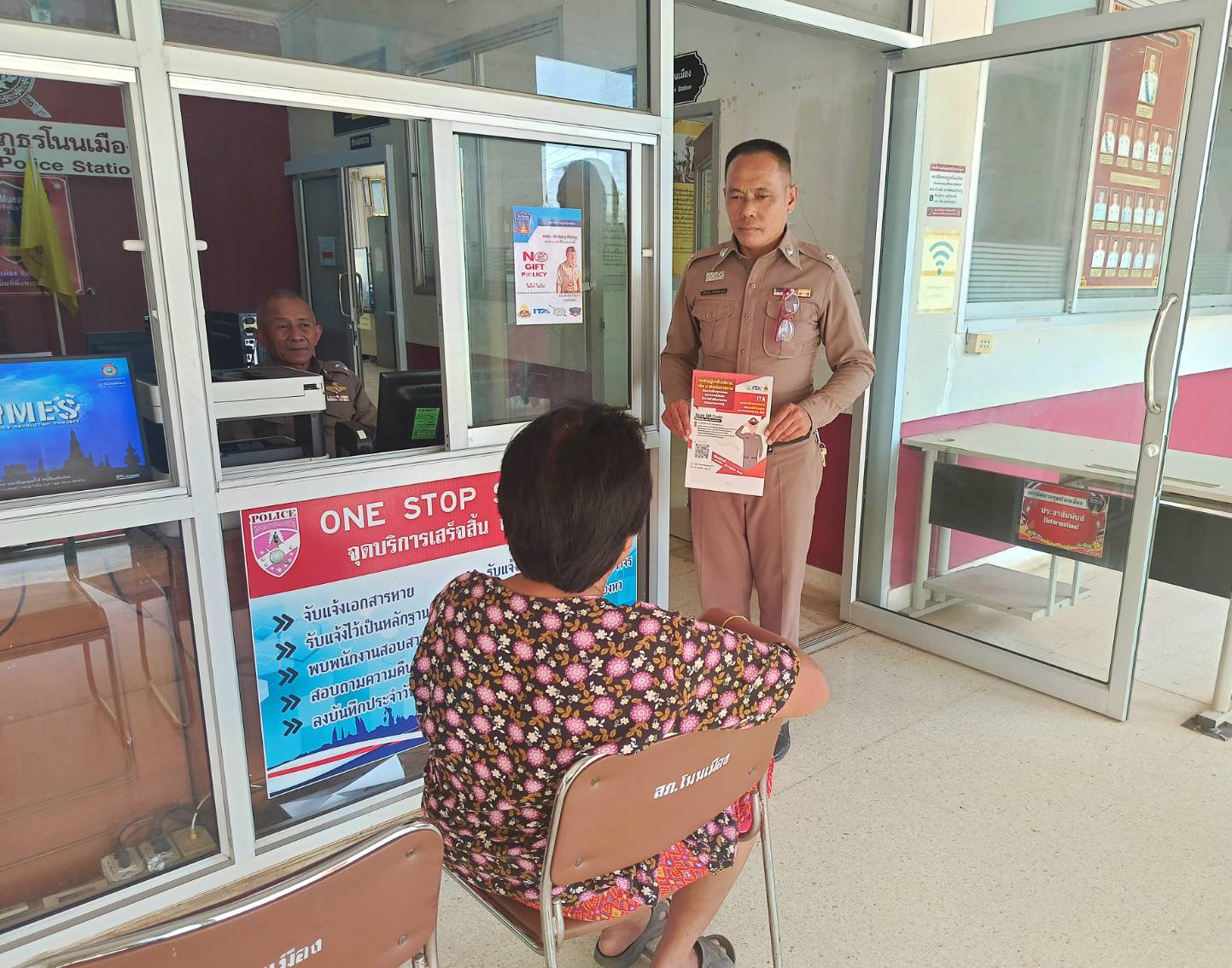 พ.ต.ท.ธีระพงษ์ เจริญธรรม สว.สภ.โนนเมือง พบปะประชาชนที่มารับบริการและติดต่อราชการ เพื่อสุ่มสอบถามการให้บริการของเจ้าหน้าที่ตำรวจ พร้อมเชิญชวนร่วมตอบแบบประเมินคุณธรรมและความโปร่งใสในการดำเนินงาน ของ สภ.โนนเมือง(EIT)